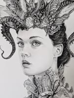 She stands as a protector, crowned in creatures and bloom, a quiet force watching over what is sacred and untold.