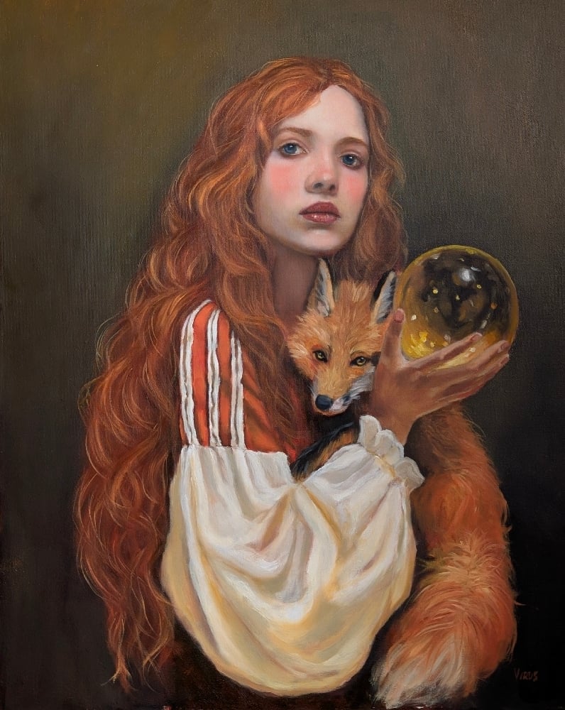 Her Pre-Raphaelite features are inspired by Gabriel Rossetti’s fiery red-haired muses,