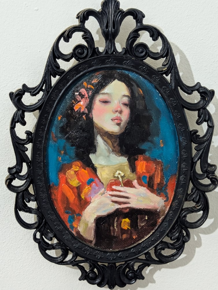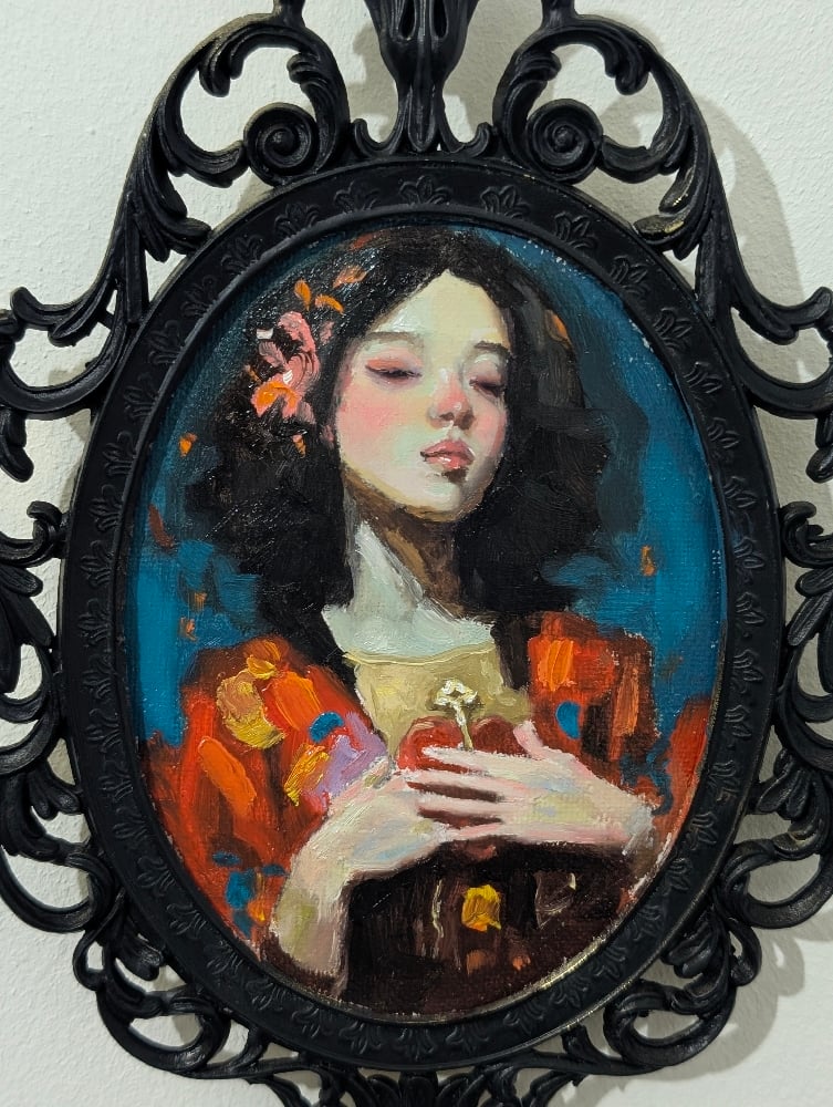 Oil on canvas, framed in a custom-made vintage Italian metal frame.